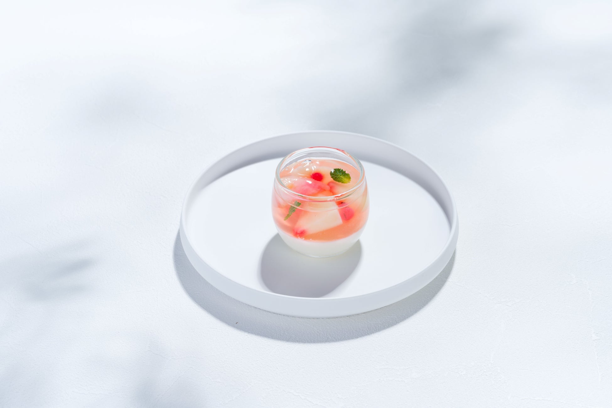 濃厚な杏仁豆腐の上に、みずみずしい桃のコンポートとエルダーフラワーのゼリーを流し込んだグラスデザートです。