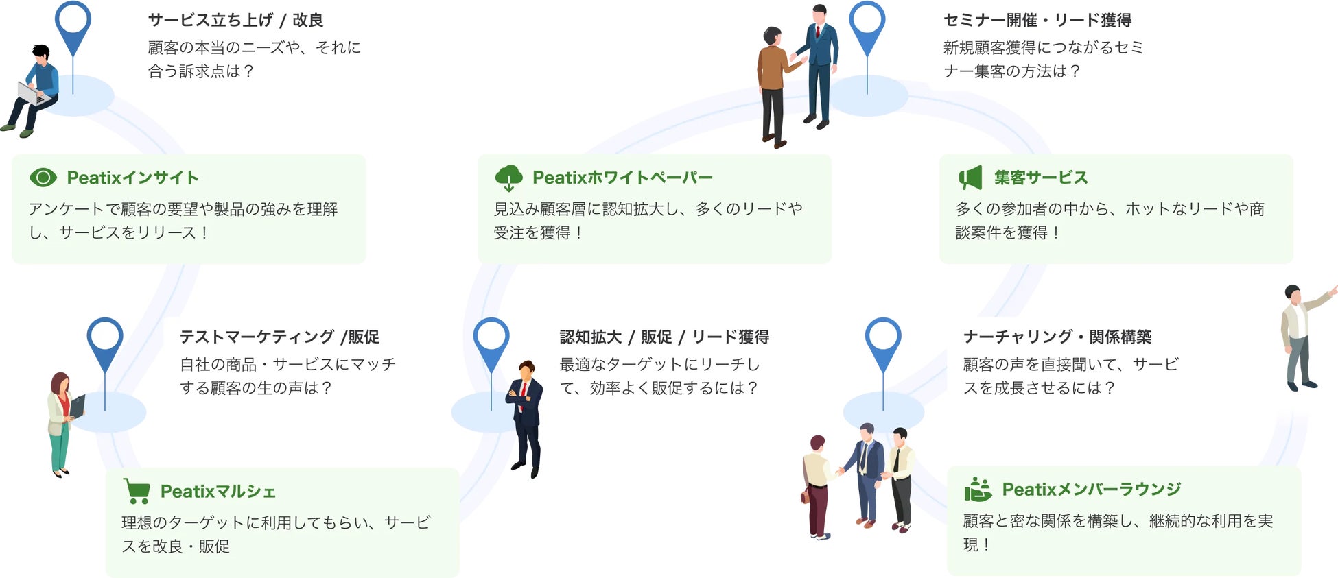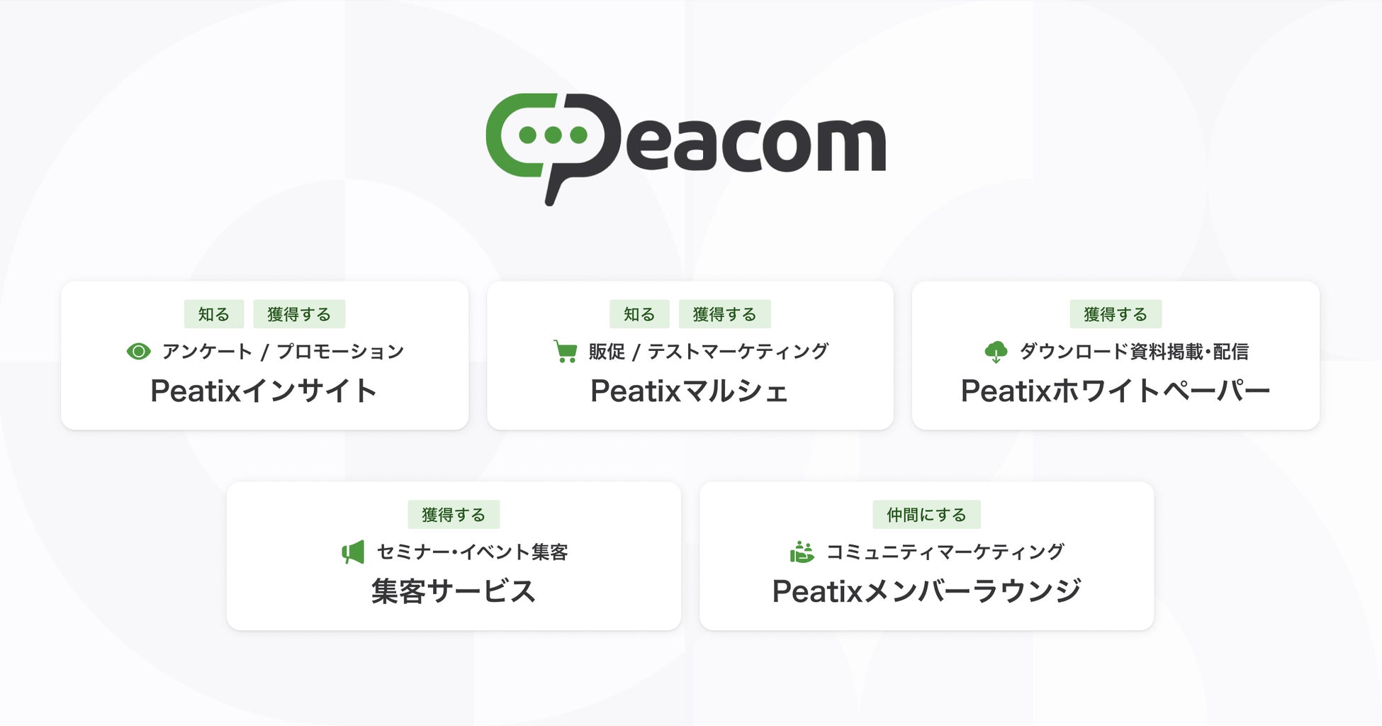 Peacomは、活動的なユーザーが多く集まるピーティックスのデータベースを活用した、複合型マーケティングソリューションです。顧客を「知り、獲得し、仲間にする」、課題に沿った5つのマーケティングソリューション「Peatixインサイト」「Peatixマルシェ」「Peatixホワイトペーパー」「集客サービス」「Peatixメンバーラウンジ」をご提供します。