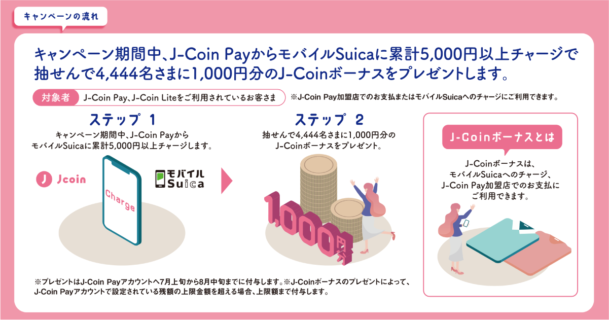 特典:キャンペーン期間中、J-Coin PayからモバイルSuicaへの累計5,000円以上のチャージを対象に、抽せんで4,444名さまに1,000円分のJ-Coinボーナスをプレゼントします。