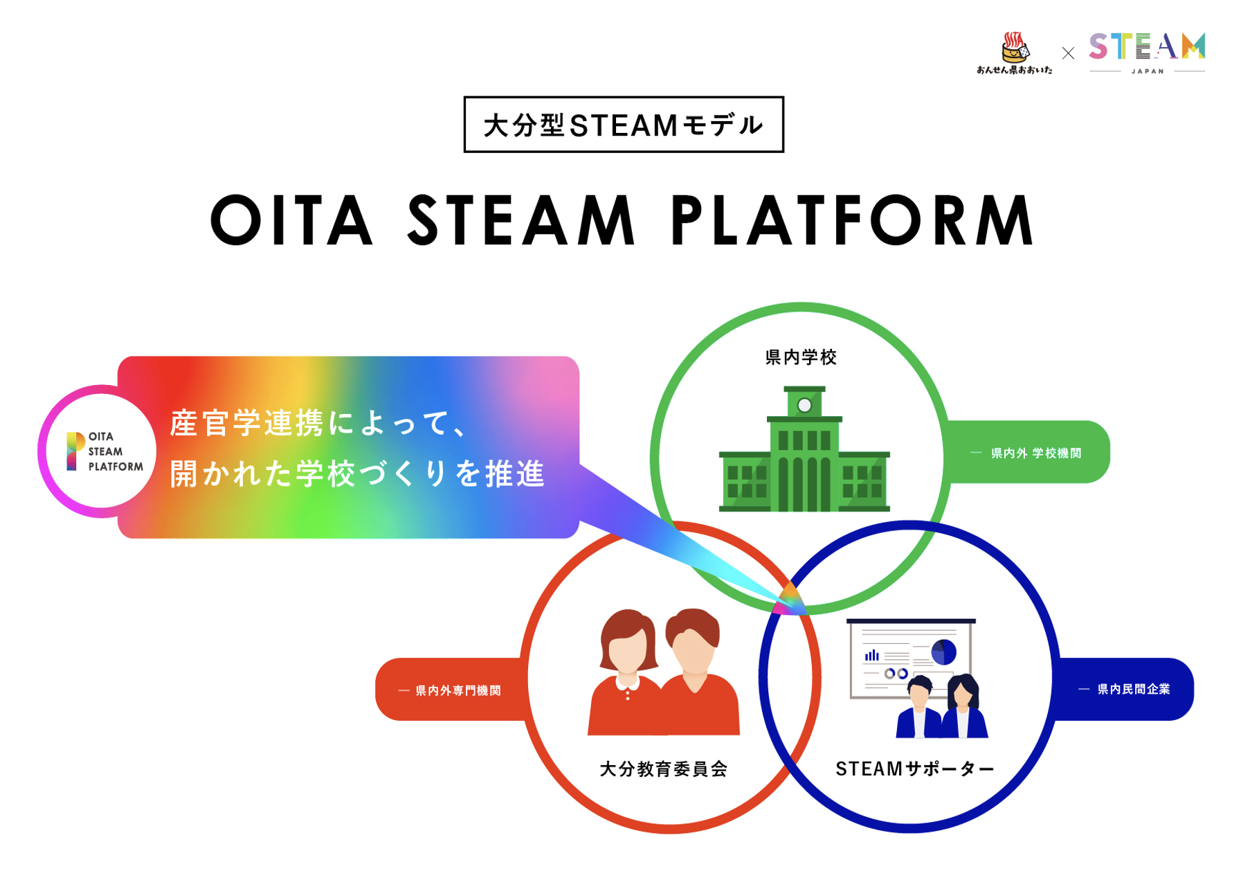 「OITA STEAM PLATFORM」とは、大分県のSTEAM教育推進を目的とした産官学連携のプラットフォームです。自治体、教育委員会、民間企業、学校機関それぞれが密接に連携することで、包括的なSTEAM教育が学べる機会を提供します。