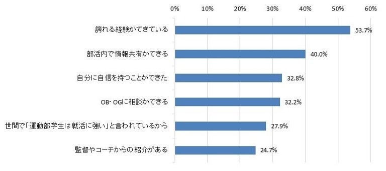 運動部学生は就職活動に有利かどうか聞いたところ、「有利だと思う」と回答した割合は77.5%だった(「有利だと思う(39.3%)」+「どちらかというと有利だと思う(38.2%)」の合計)。理由としては、「誇れる経験ができている(53.7%)」「自分に自信を持つことができた(32.8%)」など部活動の経験を糧にしているものや、「部活内で情報共有ができる(40.0%)」「OB・OGに相談できる(32.2%)」といった人間関係の強みがあがった。【図3,4】