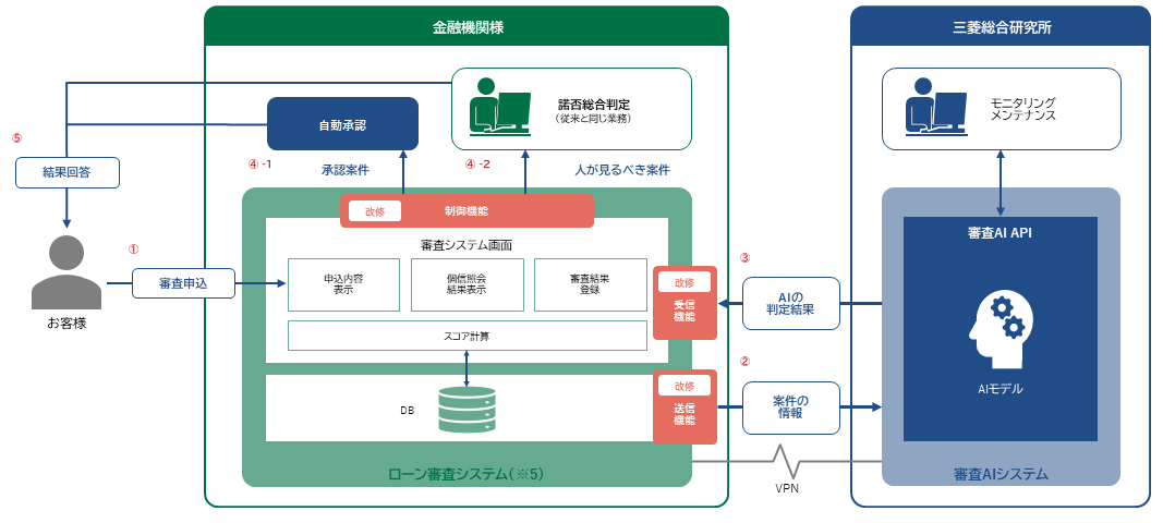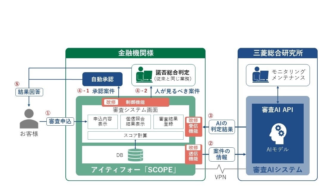 自動審査機能は、「SCOPE」に株式会社三菱総合研究所(本社:東京都千代田区、代表取締役社長:籔田健二、以下「MRI」)が提供する「審査AIサービス」を組み合わせて実現した機能です。「審査AIサービス」に搭載するAIモデルは、人間(審査官)が従来行っていた融資審査の諾否判定を学習しています。そうしたサービスと連携することで、審査の自動化を促進し、審査業務のDXを支援します。