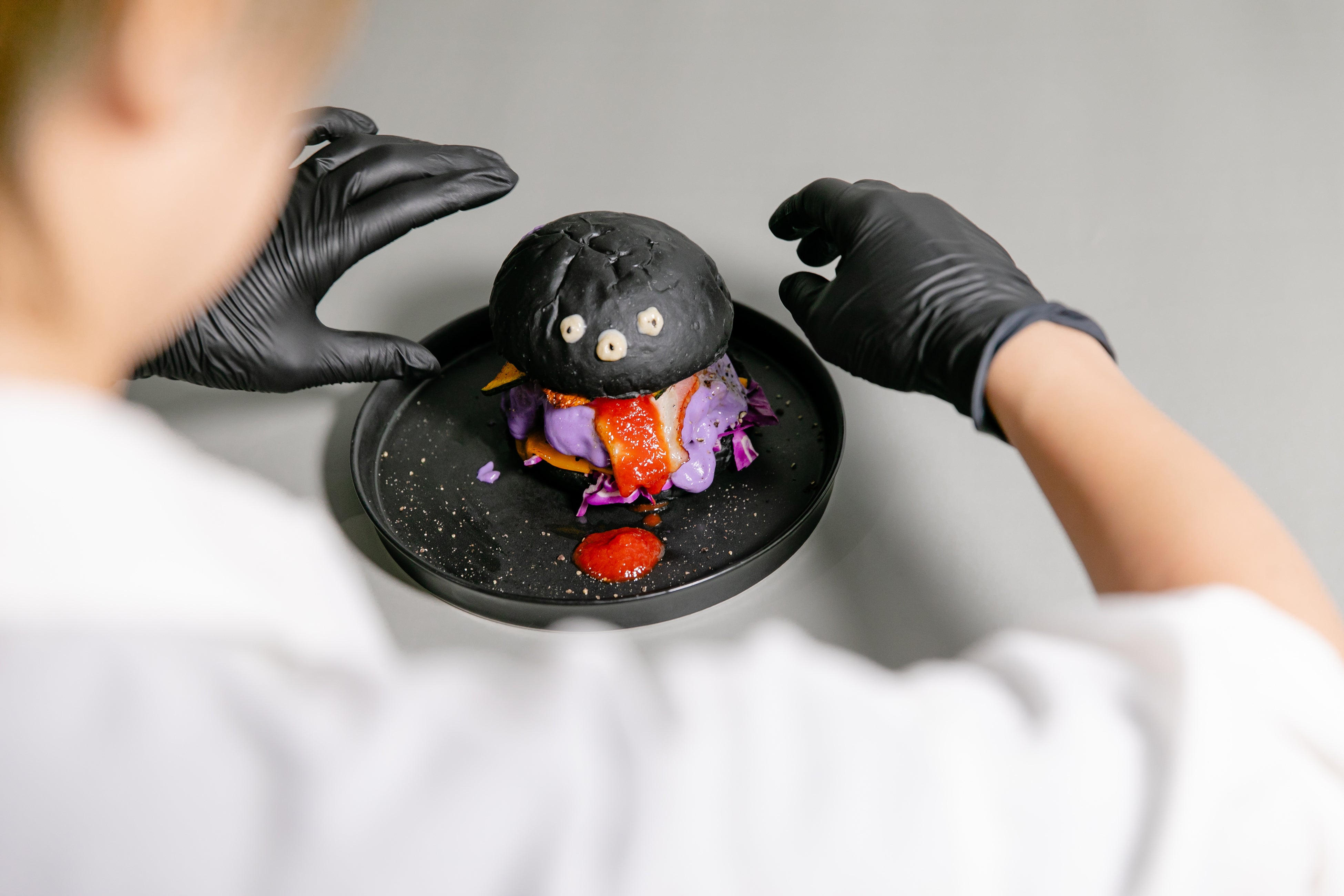 バブルスバーガーといえばカラフルなバンズ!ハロウィン限定メニューでは、黒いバンズに、ハロウィンカラーのたっぷりの具材を挟んだハンバーガーを、黒い手袋で豪快にお召し上がりください!