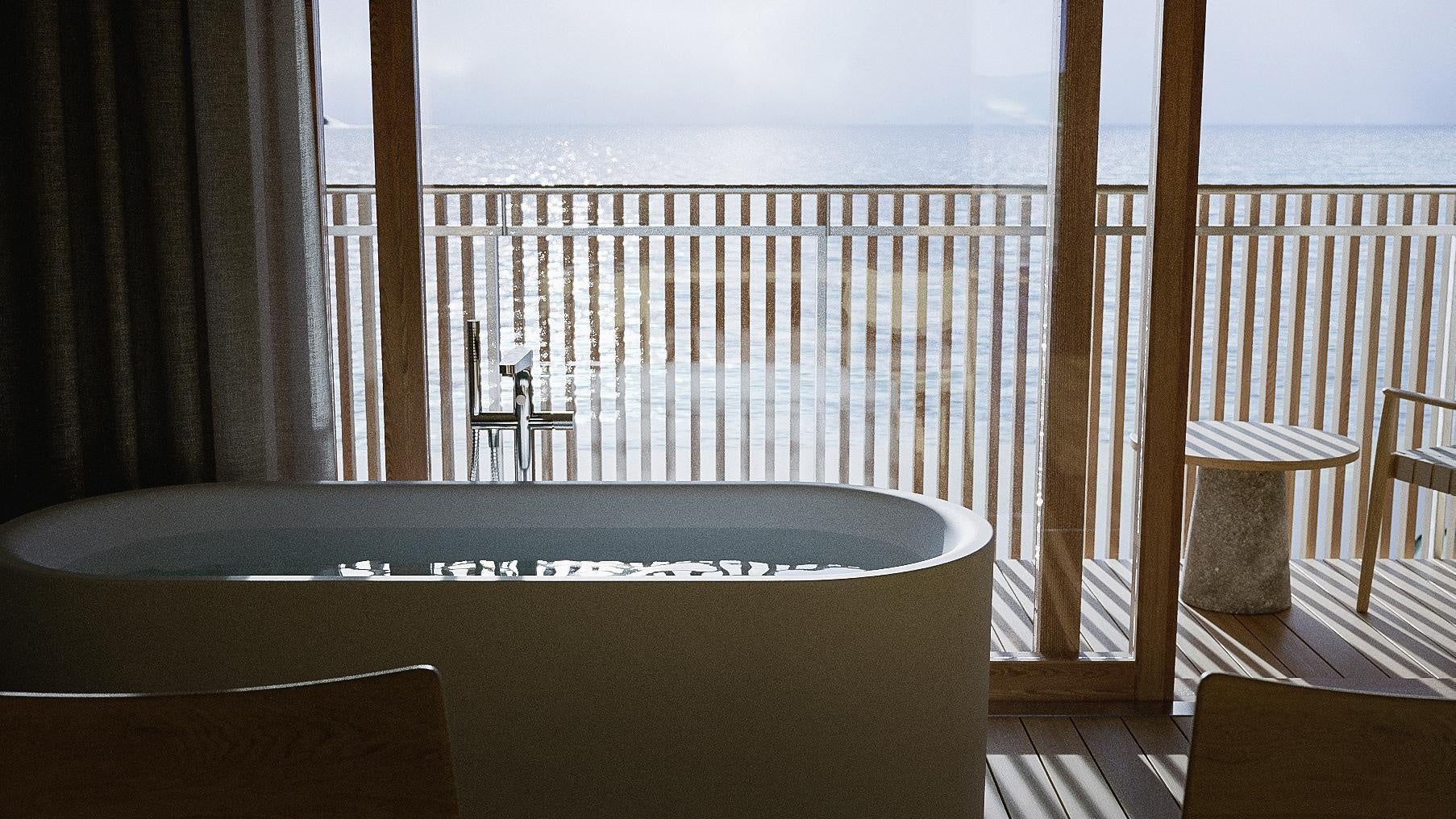 テーブルや椅子など、家具のデザインも手がける芦沢氏の知見を活かし、レイアウトや家具のきめ細やかな調整により、あらゆるシーンから視線が外部へと流れるような設計となっています。また自然と空間の関係性に遊びを持たせるために、ほとんどの棟でバスタブをバルコニー側に配置。