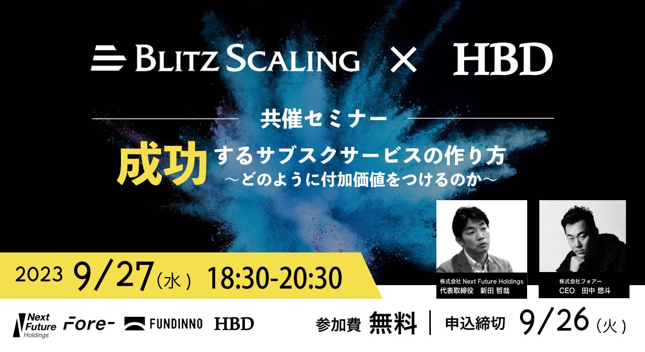 【9月27日】Blitz Scaling×株式会社HBD(光通信グループ)共催セミナー「成功するサブスクサービスの作り方 〜どのように付加価値をつけるのか〜」