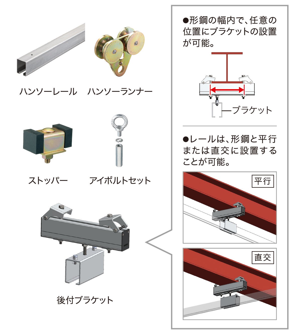 構成部品は、ランナーがレール内部を走行する「ハンソーレール」、レール内を走行する「ハンソーランナー」、ランナーの脱落防止のために取り付ける「ストッパー」「アイボルトセット」、工場や倉庫の既存のH形鋼に加工無しで取付可能な「後付ブラケット」です。