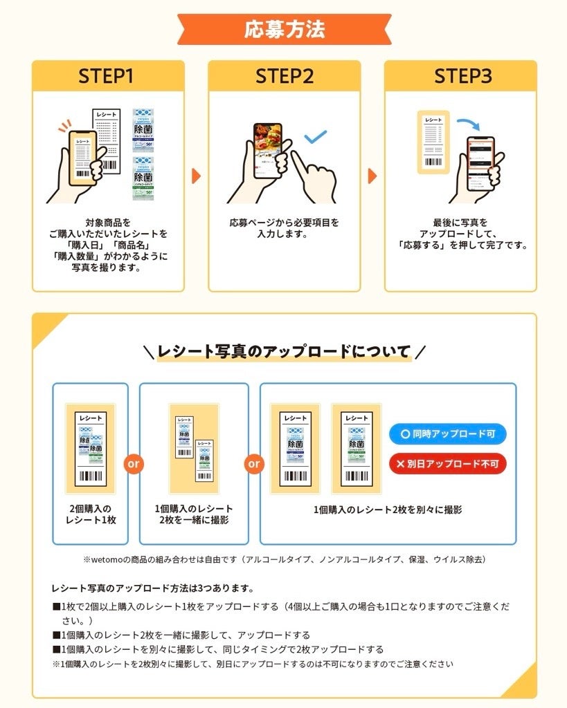 ① wetomoを2個購入し、その対象商品のレシートを撮影