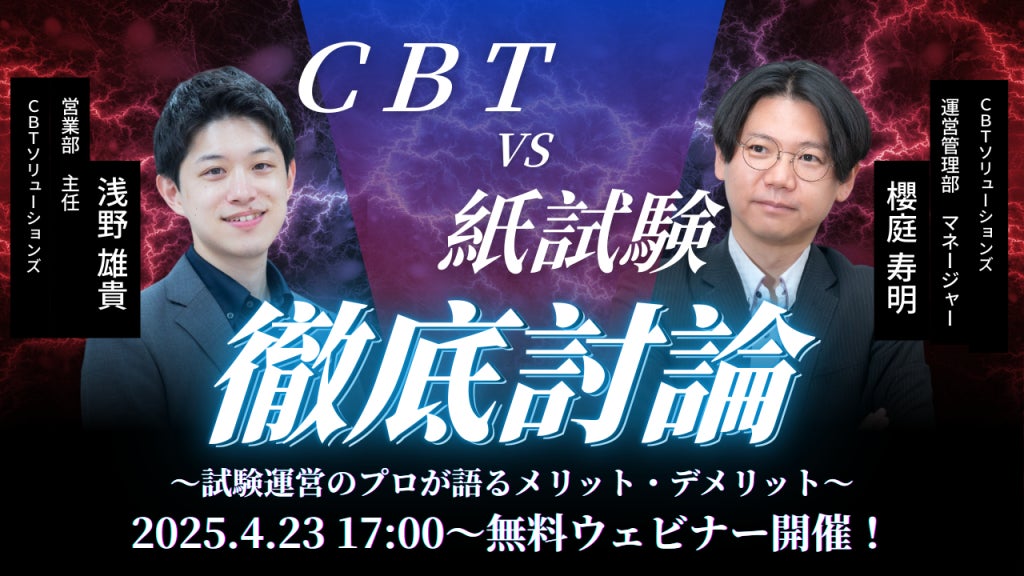 CBT・IBT試験等の試験運営業務をメイン事業とする株式会社CBTソリューションズ(本社:東京都千代田区、代表取締役社長:野口功司、以下CBTS)は、2025年4月23日 (水) 17:00〜18:00にて無料ウェビナー『CBTvs紙試験~試験運営のプロが語るメリット・デメリット~』を開催いたします。
