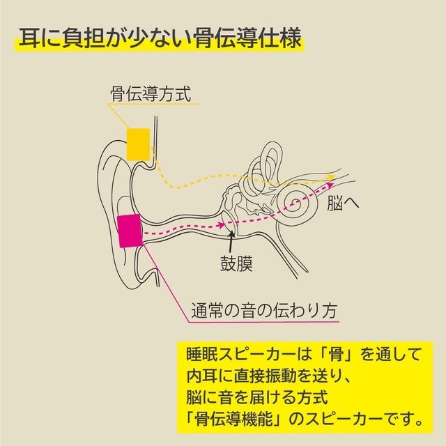 睡眠スピーカーは「骨」を通して内耳に直接振動を送り、脳に音を届ける方式「骨伝導機能」のスピーカーです。