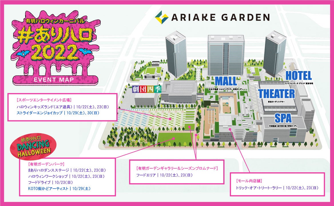 | イベント概要 イベント名:有明ハロウィンカーニバル #ありハロ2022 日時:2022年10月22日(土)、23(日)、29(土)、30(日)※荒天中止 場所:有明ガーデン イベントスペース各所 有明ガーデンパーク/スポーツエンターテイメント広場/有明ガーデンギャラリー/シーズンプロムナード/モール内 主催:住友不動産商業マネジメント株式会社 内容:ダンスステージ/スタンプラリー/エア遊具/ワークショップ/フードトラック/ストライダーエンジョイカップ/KOTO街かどアーティスト/フードドライブ ▼有明ハロウィンカーニバル「#ありハロ2022」特設サイトはこちら https://www.shopping-sumitomo-rd.com/ariake/ariharo/ ▼「#ありハロオリジナルダンス」はこちら https://eqm.page.link/byKT |