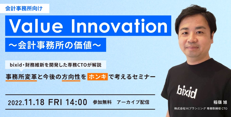 経営判断の“次の一手”を加速させる経営支援クラウド『bixid(ビサイド)』を提供する株式会社YKプランニング(本社:山口県防府市、代表取締役:岡本 辰徳)は、11月18日(金)に、会計事務所向けに「事務所変革と今後の方向性をホンキで考えるセミナー」をオンラインで配信いたします。