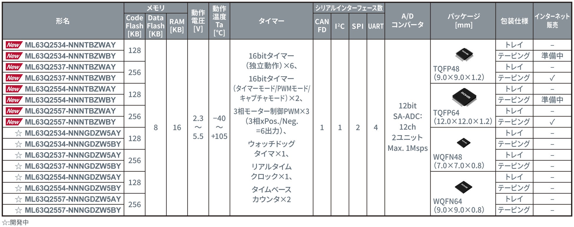 AIマイコンは、メモリサイズやパッケージ、ピン数、梱包仕様の違いで16機種をラインアップ予定。2025年2月より量産を順次開始している製品(サンプル価格3,000円/個:税抜)は、TQFPパッケージの8機種です。そのうち、メモリ(Code Flash)サイズ256KB、テーピング梱包の2機種は、マイコン評価ボードとともにチップワンストップ™、コアスタッフ™オンラインなどで購入可能です。