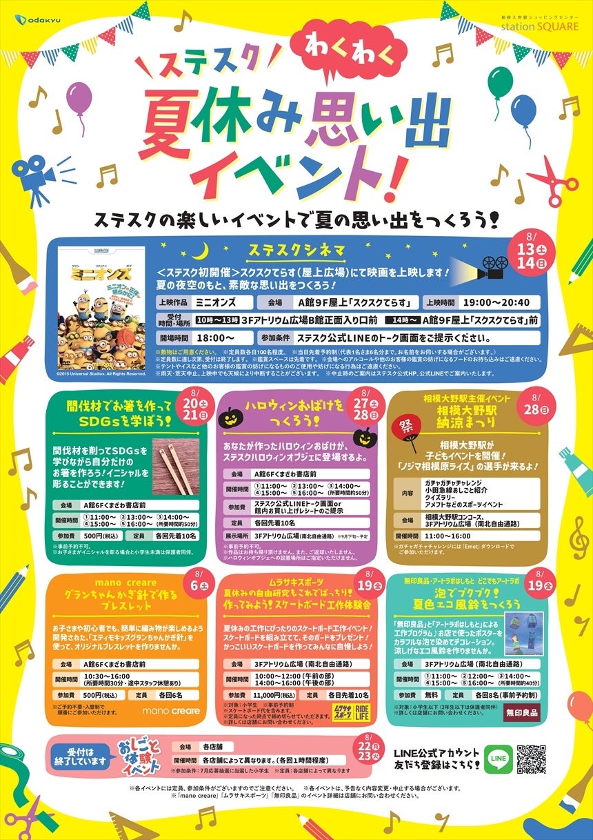 メインイベントは、当館初開催となる「ステスクシネマ(屋上シネマ)」!夏の夜空のもと屋上広場で上映される映画「ミニオンズ」を家族でゆっくりお楽しみいただけます。また小田急線「相模大野駅」が主催する「納涼まつり」や、「自由研究におすすめ!無印良品やムラサキスポーツのワークショップ」など、8月中に8種類ものイベントを開催!!