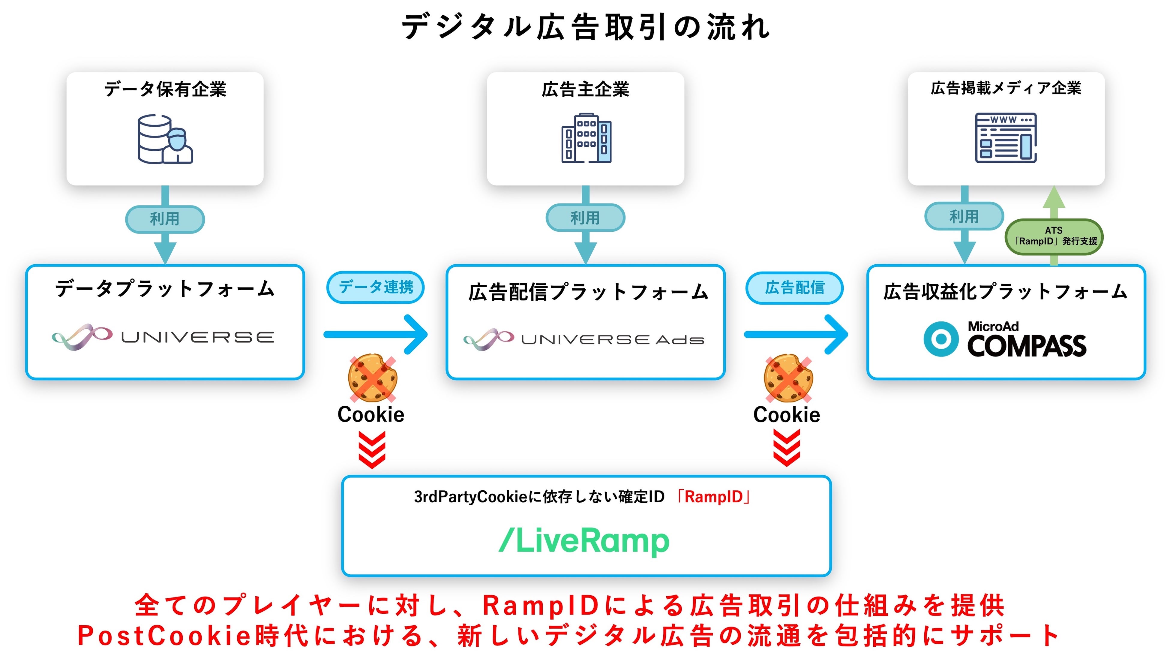 データ保有企業は、「RampID」を導入することで、3rd Party Cookieを利用せずに「UNIVERSE」へのデータ提供が可能になります。「UNIVERSE」へ蓄積されたデータは、「UNIVERSE Ads」を通じて様々な企業に活用されることで、Cookie規制後も継続的に保有データの収益化が期待できます。