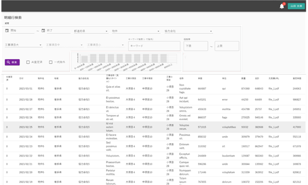 明細行蓄積AIは、過去の協力会社見積の明細行をデータベース化し、蓄積された見積データを多様な検索条件で比較・分析できる仕組みです。