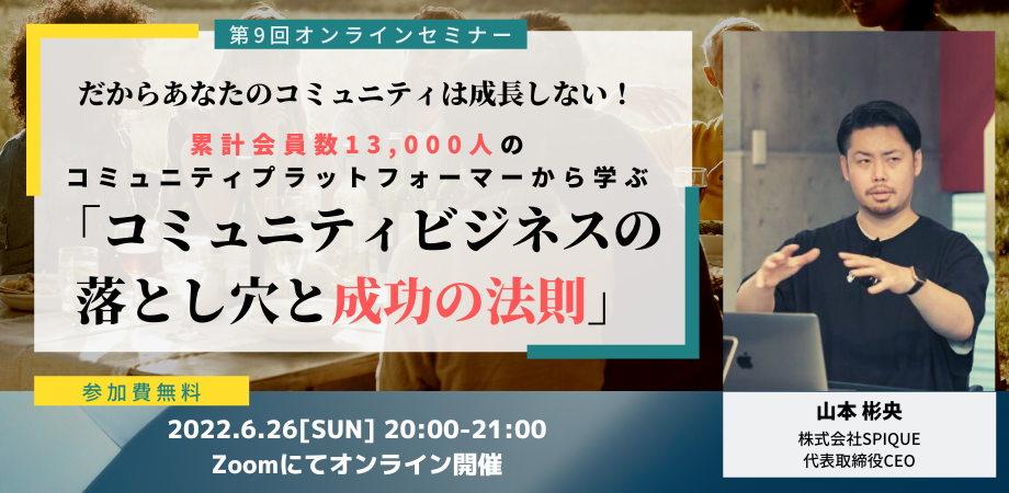 人のつながりを価値に変える株式会社SPIQUE(株式会社スパイク本社:福岡県中央区、代表取締役社長:⼭本彬央、以下 SPIQUE)は、6月26日(日)20時より「だからあなたのコミュニティは成長しない! 累計会員数13,000人のコミュニティプラットフォーマーから学ぶ コミュニティビジネスの落とし穴と成功の法則」と題し、新たな手法として注目されているコミュニティマーケティングやファンマーケティングを基礎から学べるオンラインセミナーを無料開催いたします。
