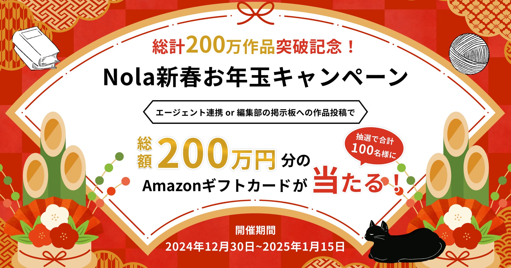 作家と企業をつなぐエージェント事業を展開する株式会社indent(本社:東京都千代田区、代表取締役社長:釜形 勇気 以下、「indent」)は、このたび、運営する創作プラットフォーム「Nola(ノラ)」で執筆された原作が総計200万作品を突破したことを受け、日頃から「Nola」をご利用いただく作家の皆さまへの感謝を込め、2024年12月30日(月)10:00から2025年1月15日(水)23:59まで、【総計200万作品突破・2025年新春お年玉キャンペーン】を開催いたします。Nolaで執筆中の作品から、「エージェントに提出」または「Nolaノベルへ投稿」いただくと、抽選で100名さまに総額200万円分のAmazonギフトカードが当たります。