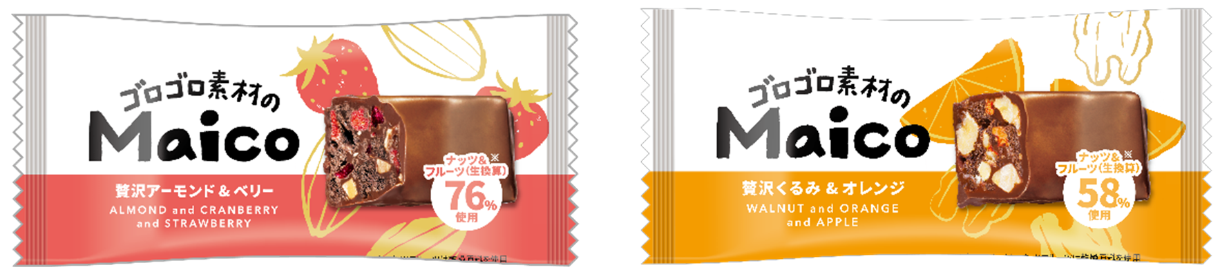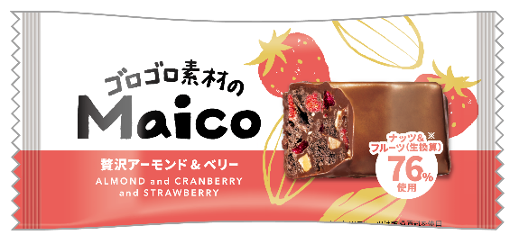本商品は、贅沢に使用したナッツやフルーツなどの素材を楽しむことができ、食べやすいちょこっとサイズを目指して開発いたしました。素材のゴロゴロ感にもこだわり、「Maico アーモンド&ベリー」は”生換算76%”、 「Maicoくるみ&オレンジ」は“生換算58%”と贅沢に素材を使用し、食べ応えや満足感もしっかり感じられます。