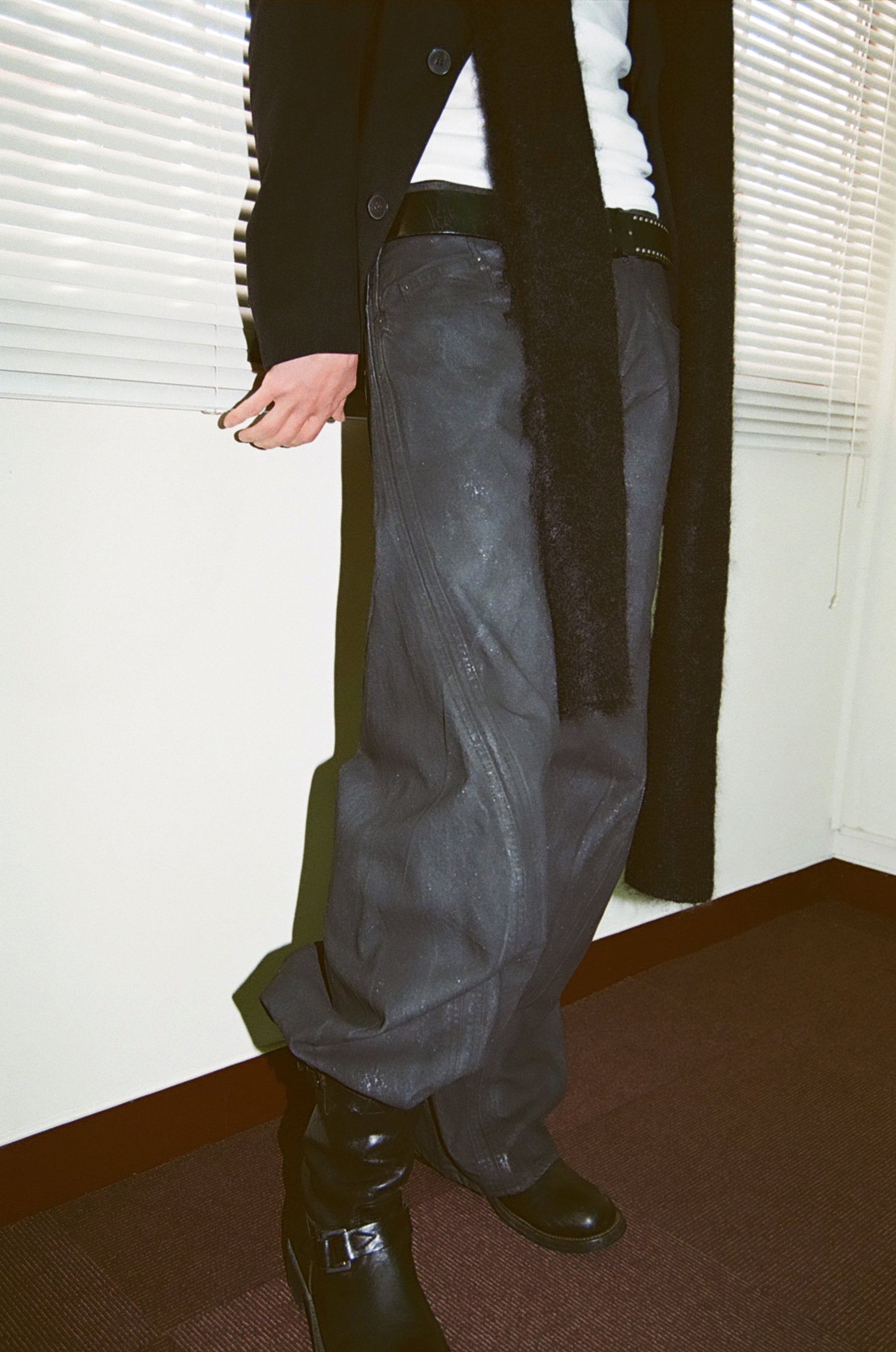 14ozのムラ糸空紡糸によるブラックデニムを使用したワイドシルエット立体裁断ジーンズ。定番展開しているシグネチャーアイテムですSTUDIOUS限定カラーで全面にシルバーとブラックのフォイルコーティング加工を施したラグジュアリー感のあるある仕上がり。