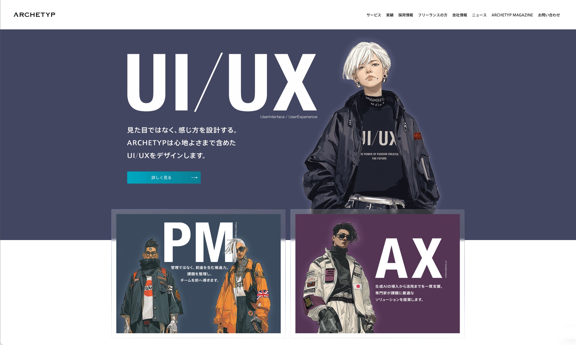 今回のリニューアルでは、その変化を正しく伝えるために情報設計を再構築し、サービス内容や職種ごとの価値が直感的に理解できる構成へ刷新しました。 あわせて、ARCHETYPらしいクリエイティビティを残しつつ、「関わりたいと思える会社」としての魅力が伝わる表現を目指しています。