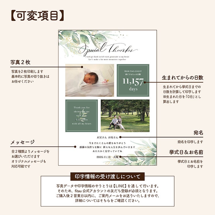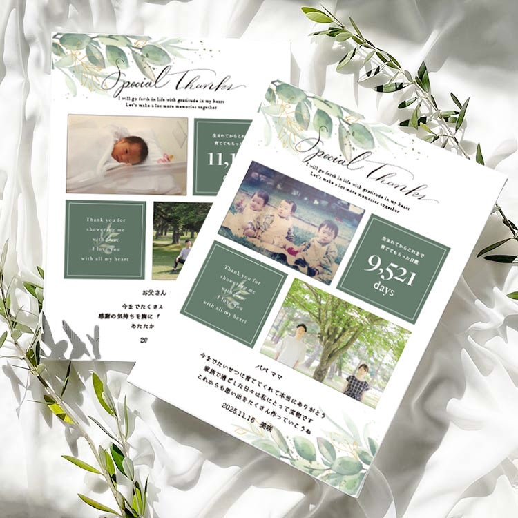 fitauの子育て感謝状は2枚セットになっているので、 新郎新婦の両家に一枚ずつ贈ることができるのも特徴です。