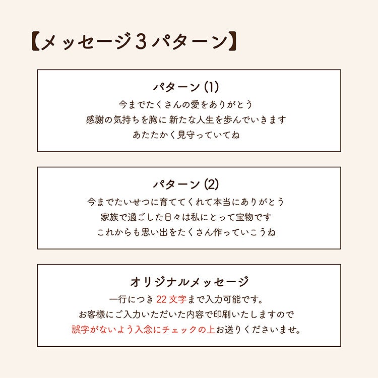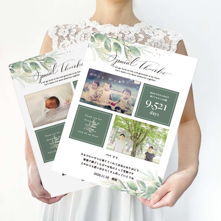 生まれてからの日数や思い出の写真と共に、感謝のメッセージが贈られる "世界にひとつだけのボード"です。