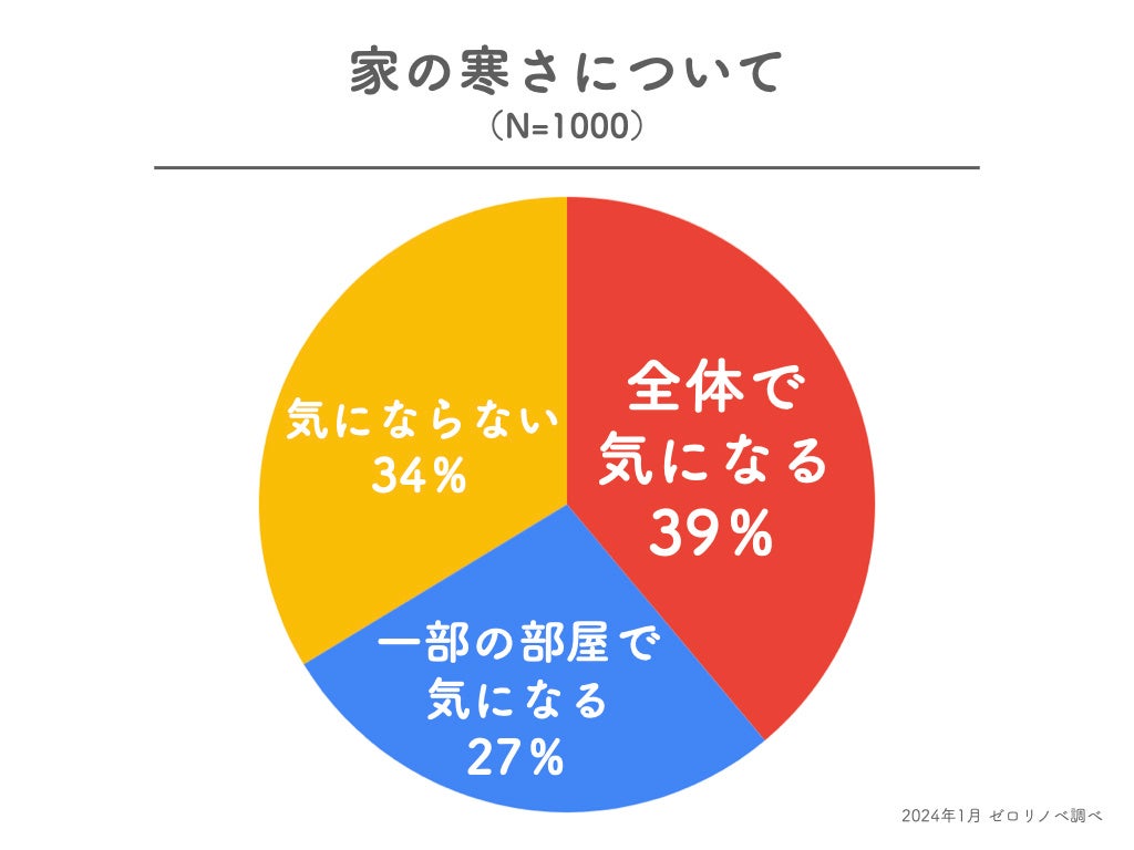 ■家の寒さは「全体で気になる」が39%で最多。ついで「一部の部屋で気になる」が27%と、全体の66%が家の寒さを気にしている。