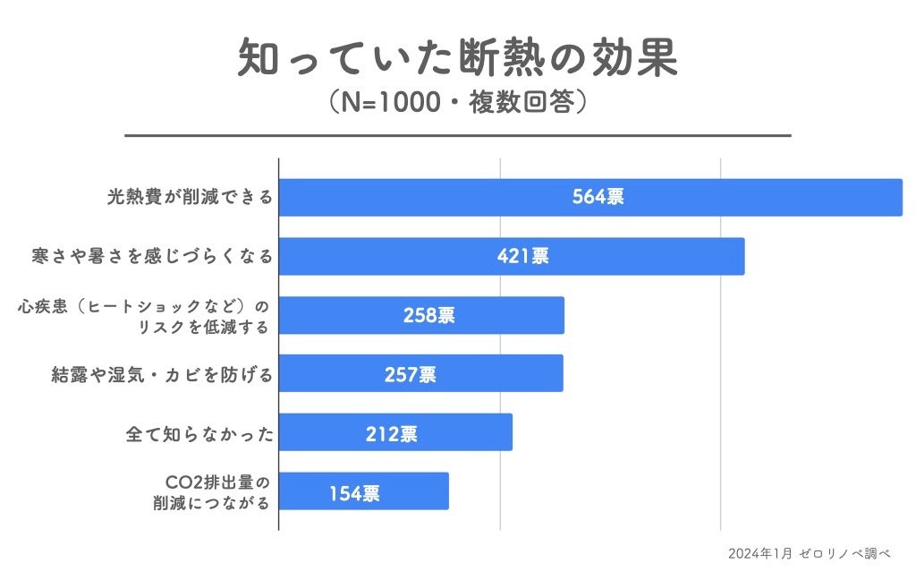 ■断熱で得られる効果として認知度が高いのは、「光熱費が削減できる」が564票で最多。