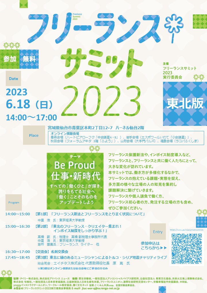 フリーランスサミット2023東北版 登壇者決定のお知らせ ~東北のフリーランス・クリエイター集まれ! インボイス制度とフリーランス新法をしっかり学ぶチャンス~