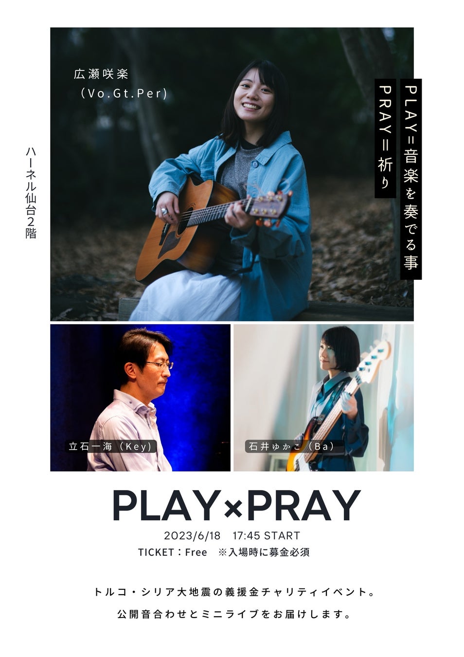 また、第3部では、東北に縁のあるミュージシャンによるトルコ・シリア地震チャリティライブ「PLAY×PRAY」を実施します。東日本大震災の際に最長期間に渡って宮城県で支援活動を行ったトルコの救援隊、義援金を送っていただいたトルコの皆さんへの恩返しとして、第2部にも登壇いただく広瀬 咲楽氏、立石 一海氏、石井 ゆかこ氏が演奏し、チャリティの収益はトルコ大使館と国境なき医師団に送金させていただきます。