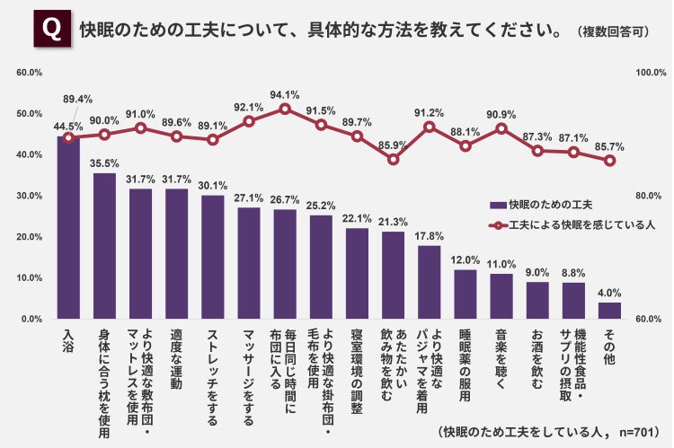 具体的な工夫の内容については、回答の多かった順に「入浴」(44.5%)、「身体に合う枕の使用」(35.5%)、「より快適な敷布団・マットレスを使用」「適度な運動」(31.7%)と続いています。