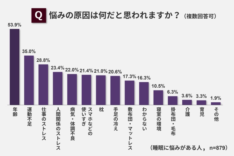 続いて、どのようなことで悩んでいるか質問したところ、回答の多かった順に「就寝中に何度か目が覚める」(60.1%)、「眠りが浅い」(44.0%)、「トイレが近い」(42.8%)という結果になりました。