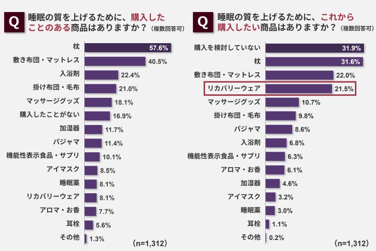 次に、「睡眠の質を上げるためにこれから購入したい商品はありますか?(複数選択可)」と質問したところ、今回から選択肢に追加した「リカバリーウェア」が4位にランクインしました。