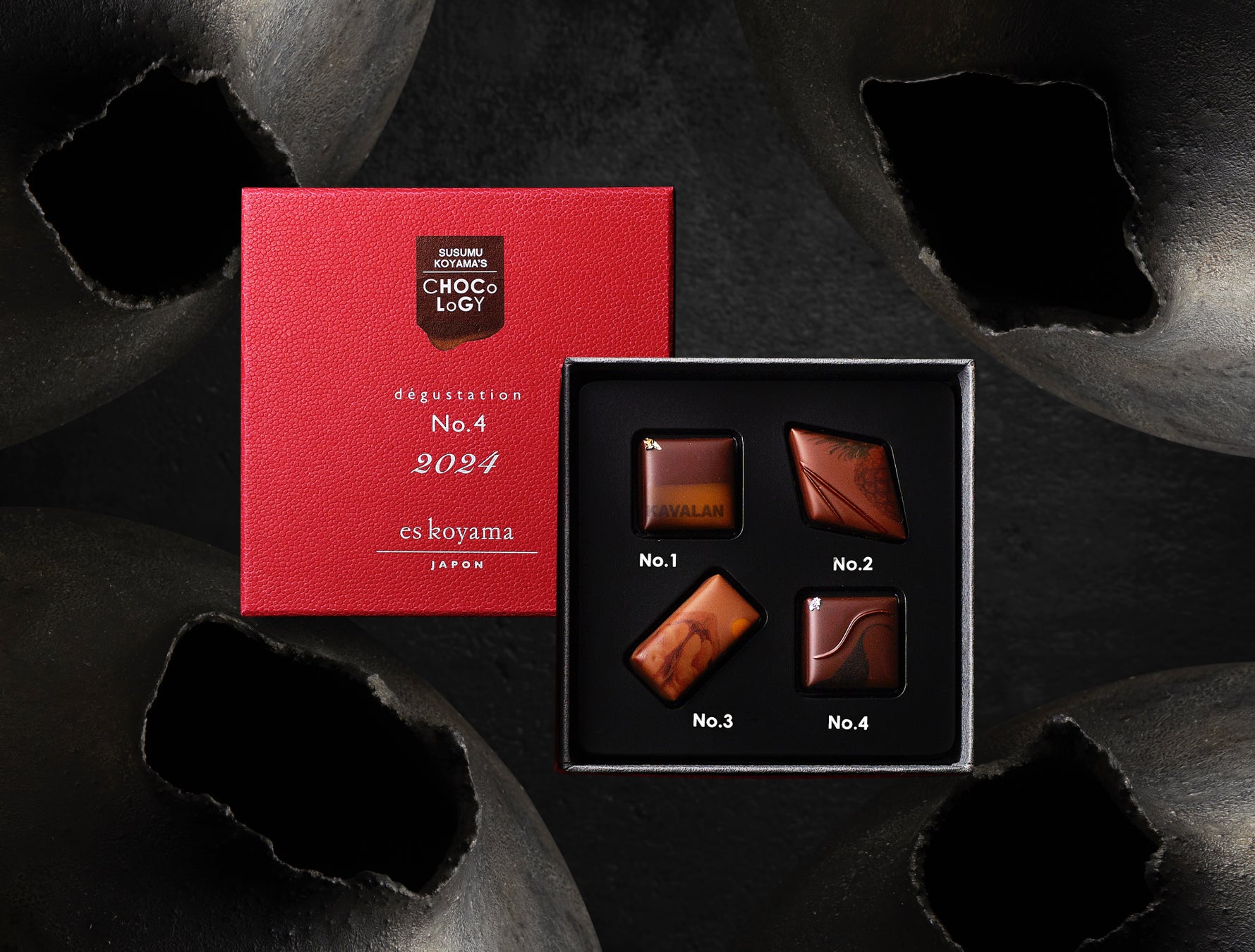 2025年11月1日発売のCHOCOLOGY 2025は、小山氏が魅せられたINDULT PARIS(パリの香水ブランド)の4つの香水を味覚に移し変えたもの。香りと味わいが響き合い、食べた人を魅了する。