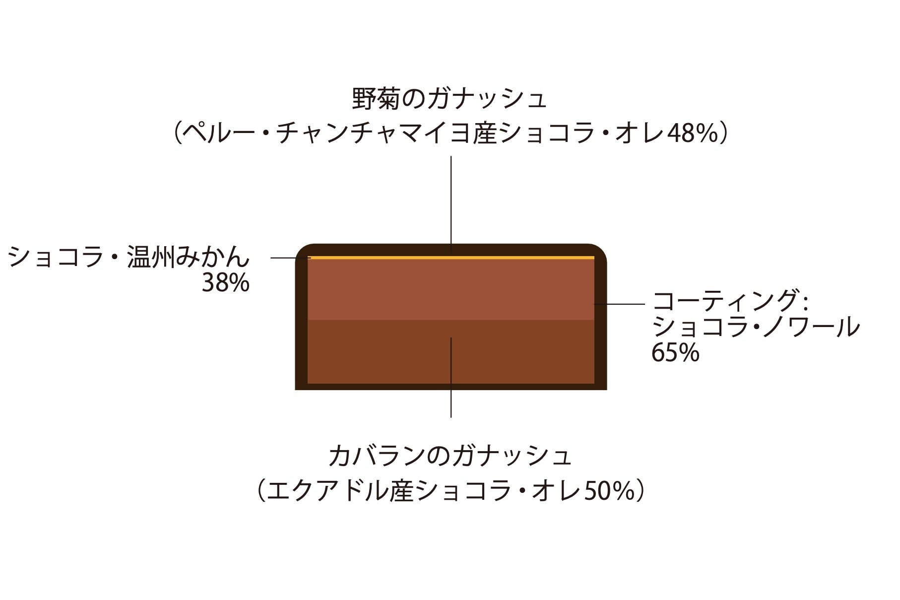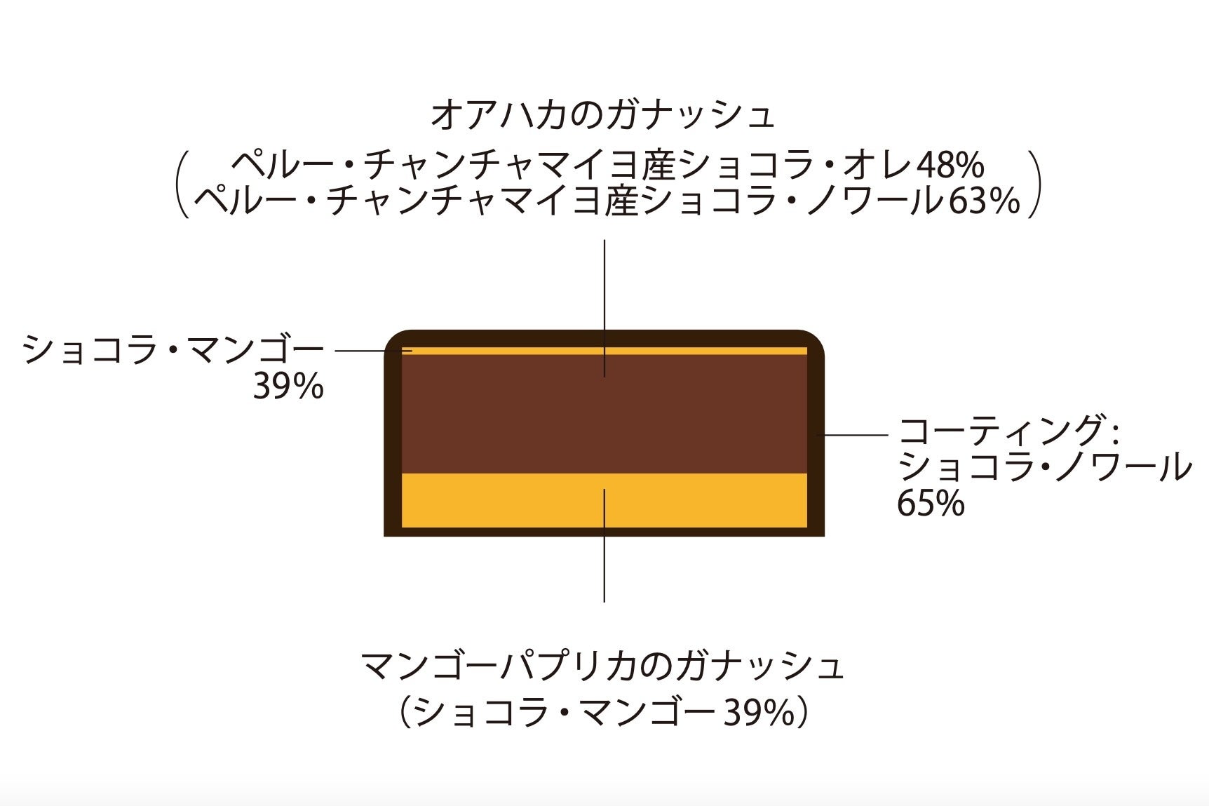 日本語訳:香り高くスパイス感のあるガナッシュ。パプリカの香り、スパイスのニュアンス、そしてマンゴーのやさしい甘みが、カカオと完璧なバランスが描かれています。