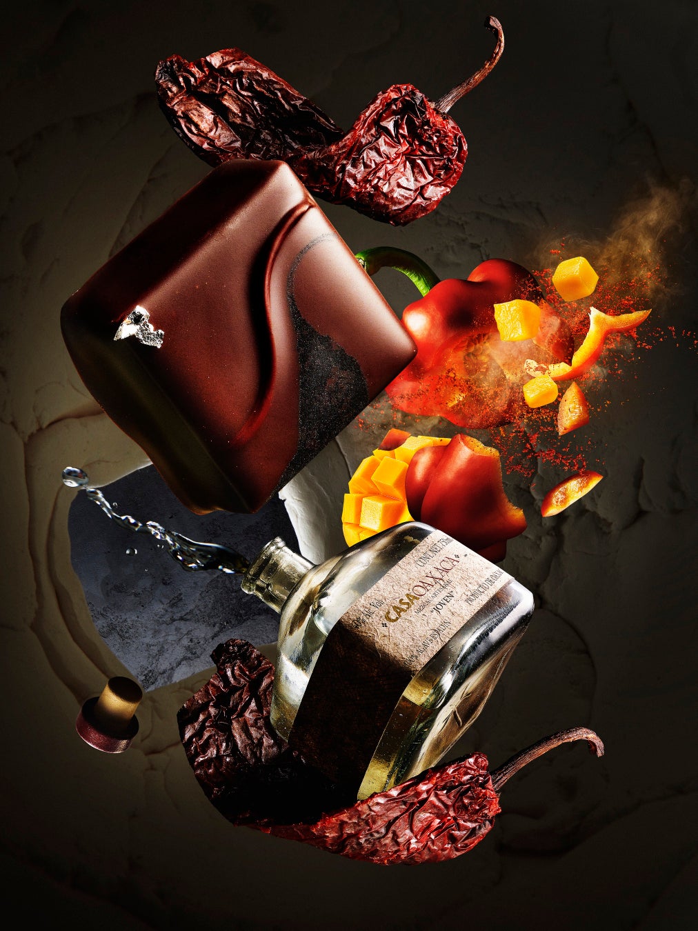 原文:Chile Pasilla d’Oaxaca & paprika fumé, mangue est une ganache délicieusement relevée. Le paprika, les notes de poivre et la douceur de la mangue sont parfaitement équilibrés avec le cacao.
