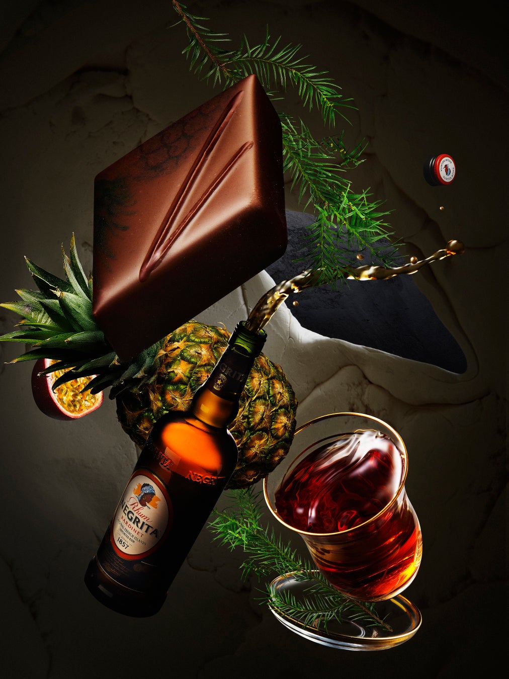 日本語訳:香りが繊細に表現されていて、チョコレート、ラム、パイナップルが見事に調和している。