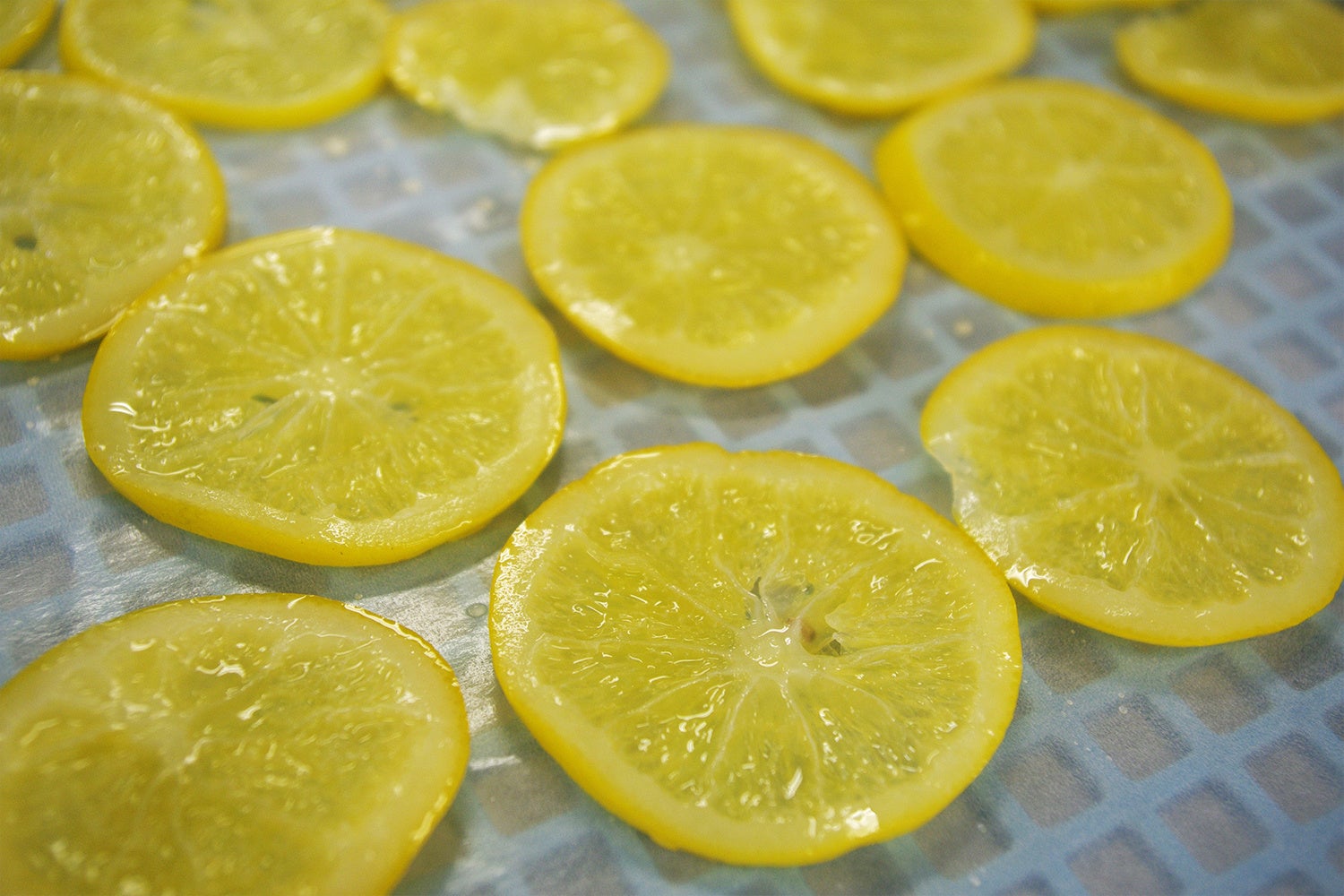 完熟して黄色くなったらレモンを薄くスライスして、真空状態で約2カ月間てんさい糖漬けにします。