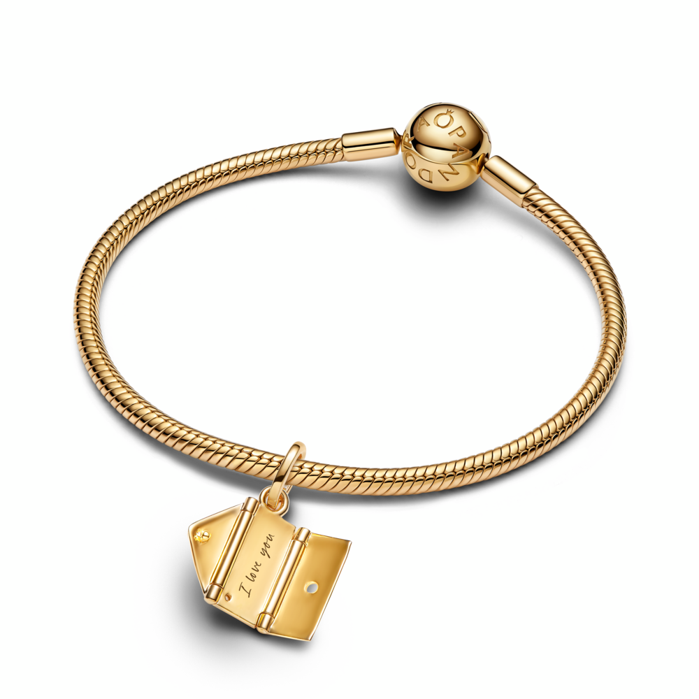 14Kゴールドプレーティングの開閉可能なラブレター風ダングルチャームは、内側と前面に刻印が可能で、心のこもったメッセージを小さな文字で刻むことができます。