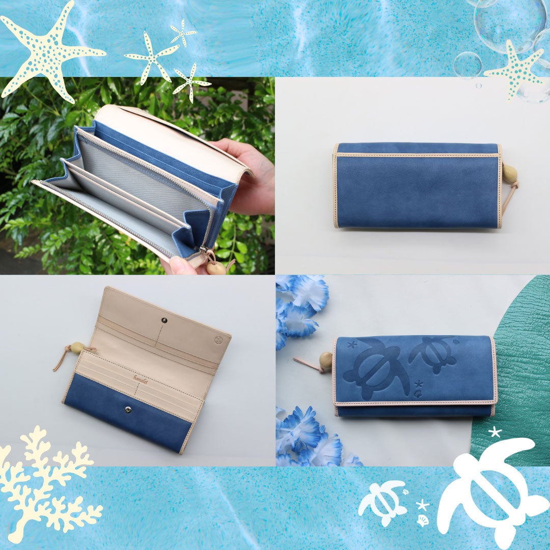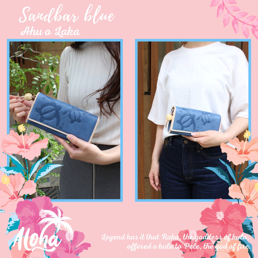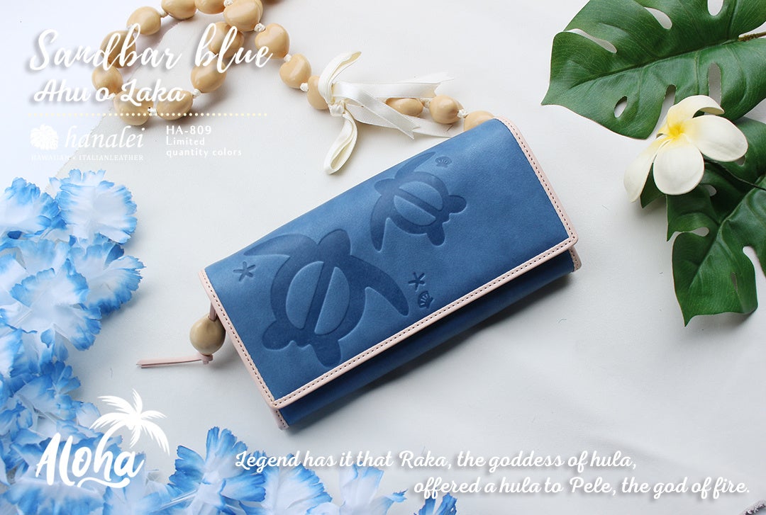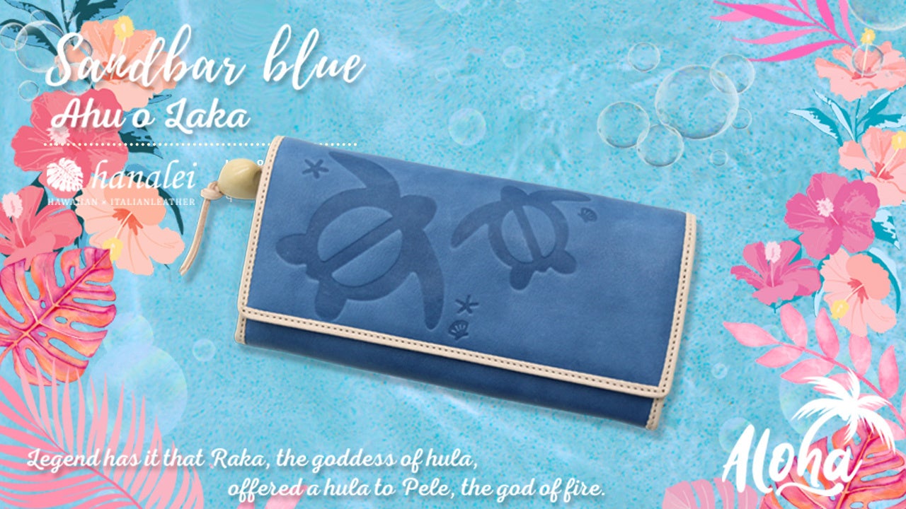 「かわいい!」「一目惚れ」と言っていただける、幸運を運ぶ4種のハワイアンモチーフをナチュラルなイタリアンレザーに型押しした被せ付き長財布のハナレイシリーズより、数量限定カラー「サンドバーブルー」が登場。