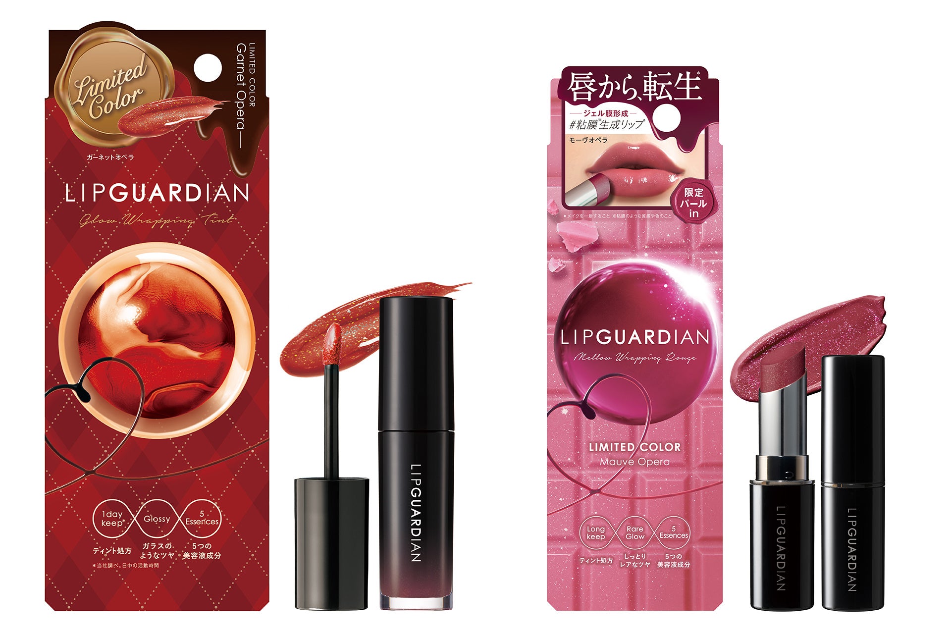 神がかれ、唇。大人の上質キレイの守護神 「リップガーディアン」から今年もバレンタインをコンセプトにした限定色を数量限定で発売いたします。ガラスのようなツヤ仕上がりが長時間続く、進化系※1 ティントグロス 「リップガーディアン グロウラッピングティント」から「07 ガーネットオペラ」。粘膜のようなしっとりツヤ唇を叶える粘膜※2 生成ティントリップ「リップガーディアン メロウラッピングルージュ」からは「52 モーヴオペラ」が登場。外箱パッケージもチョコレートを感じさせる、遊び心あふれるデザインに仕上がりました。