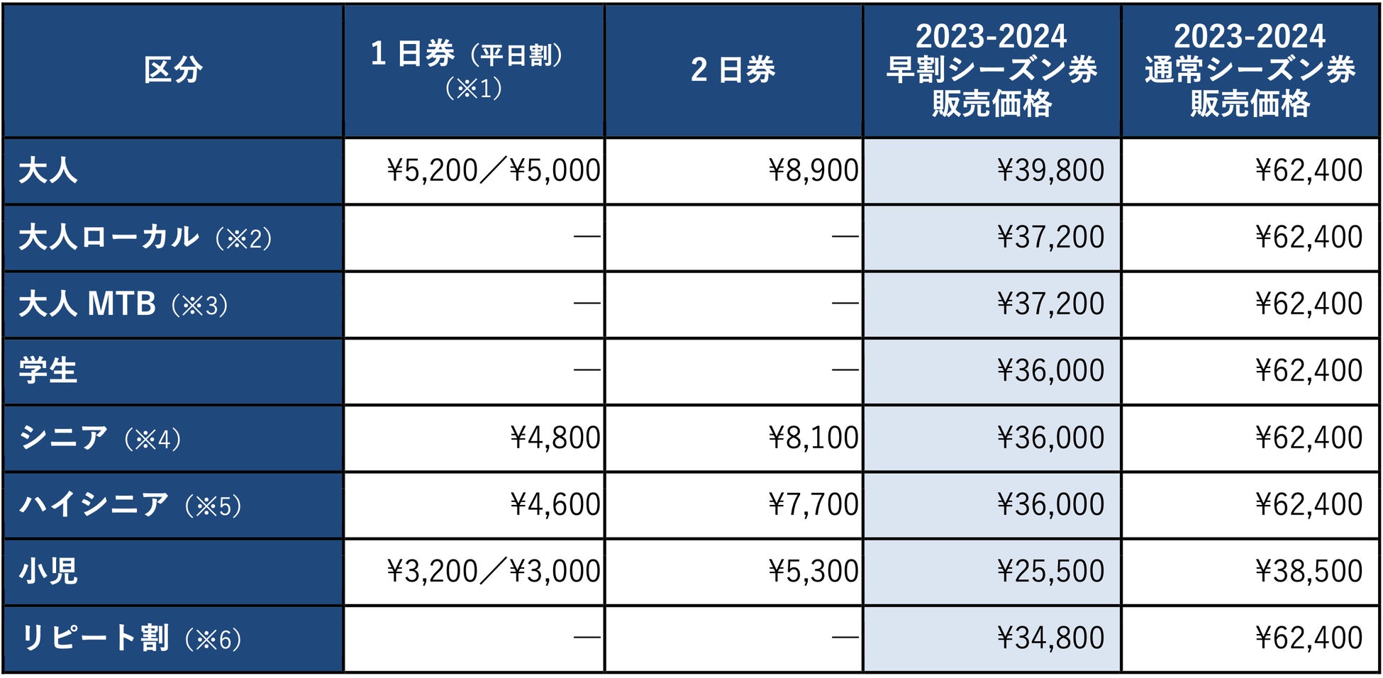 ※1...1日券の平日割は大人と小児のみ。シーズン券以外のチケットは別途保証金¥1,000が必要となります(返却時に返金)。