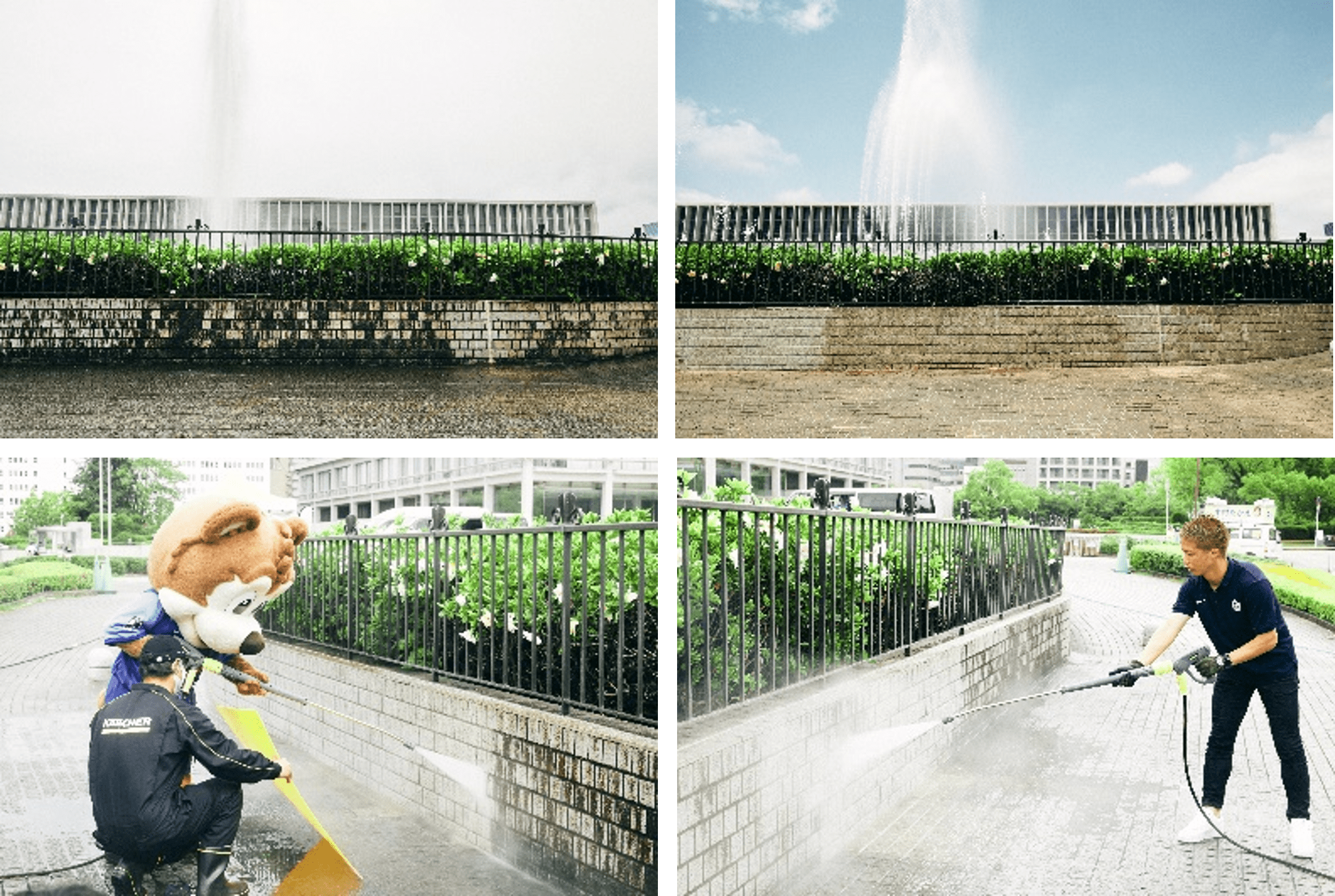 今回、広島市と、ケルヒャーがクラブスポンサー契約をさせていただいているプロサッカークラブサンフレッチェ広島のご協力のもと、原子爆弾が投下された爆心地周辺に建てられ、世界恒久平和の思いを伝え続けている「平和記念公園」内にある「平和の池」、「祈りの泉」へのクリーニング活動を実施いたしました。