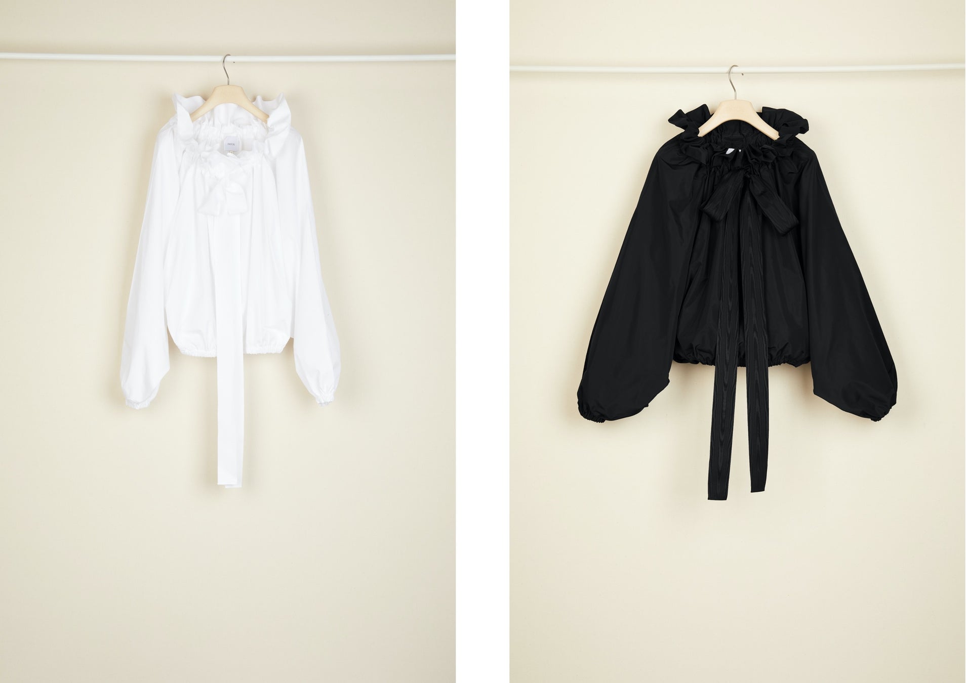 オーガニックコットンのポプリン生地を使用したブラウス。定番ライン「エッセンシャル」を代表する大人気のアイテムです。リボンをお好みの長さにブラウジングして、ネックラインを調節することができます。ホワイトとブラックの2色をご紹介します。