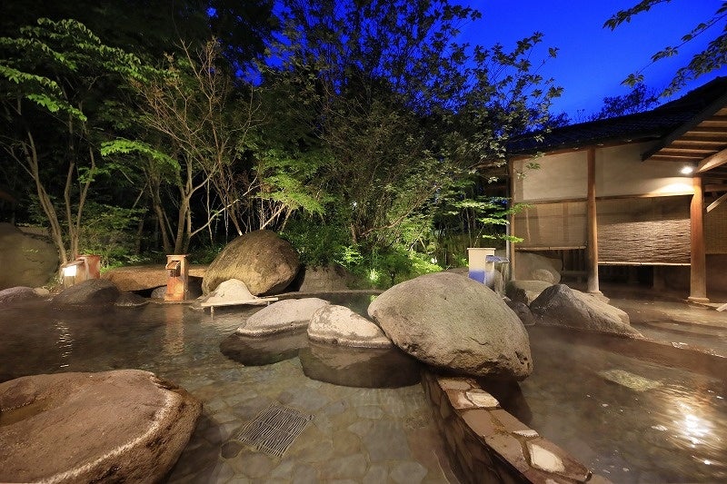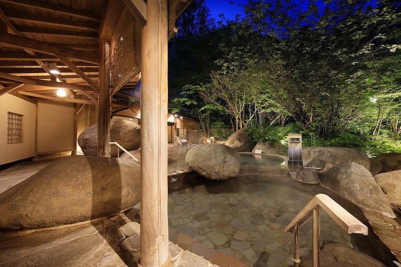 この豊富な湯量を活かし、萬国屋では、源泉を引いたお部屋を多くご用意。また、2つの大浴場に加え、この冬、規模を大きくした庭園露天風呂「桃里の湯」をリニューアル。