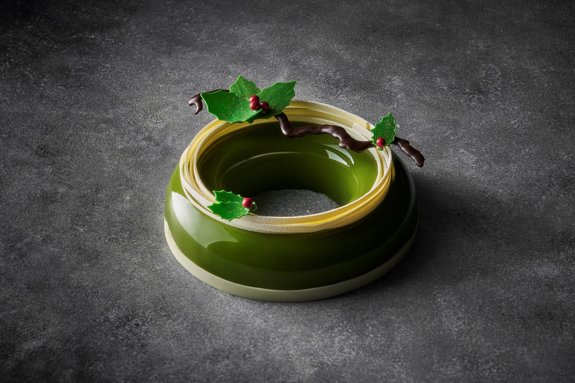 クリスマスリースをイメージした、鮮やかなグリーンが目を引く、ピスタチオ尽くしのケーキ。濃厚で香ばしいピスタチオクリームやムース、プラリネ、クランチ、ビスキュイと、異なる食感と味わいが織りなす究極のピスタチオケーキ。風味豊かなピスタチオが奏でるシンフォニーをお楽しみいただけます。