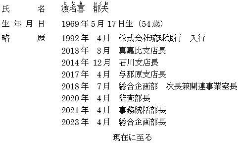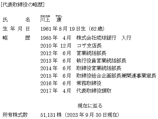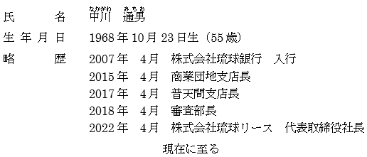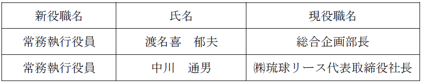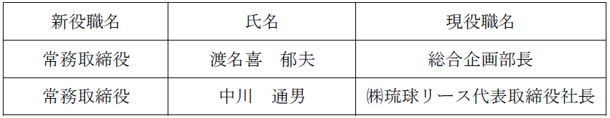 ※ 現代表取締役専務の普久原啓之は、株式会社琉球リースの代表取締役会長に就任予定です。
