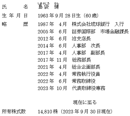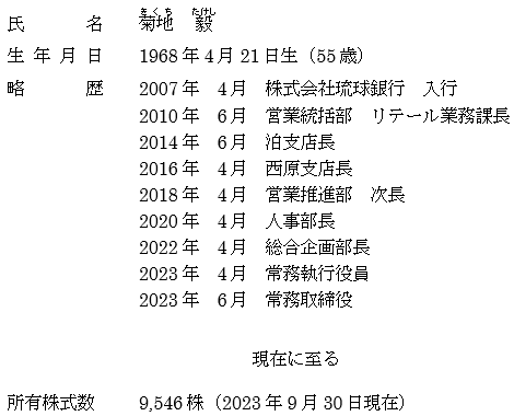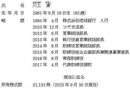 琉球銀行(頭取 川上 康)は、2024年2月22日開催の取締役会において、以下のとおり、代表取締役および役付取締役の異動について決議しましたので、お知らせします。