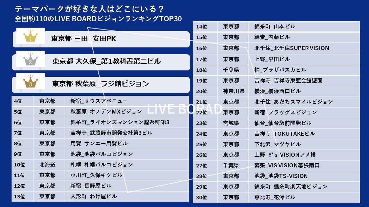 “テーマパークが好きな人”はどこにいる?全国のLIVE BOARD屋外ビジョンランキングTOP30を発表