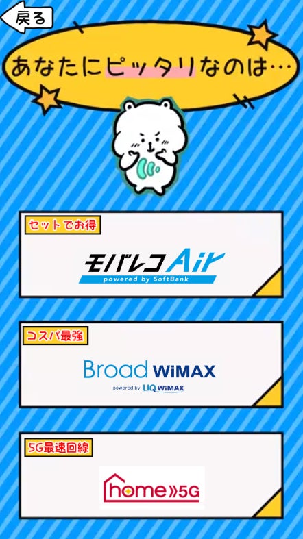 回答後にライフスタイルに合った回線を、数あるインターネット回線の中から3つ提案、気になるインターネット回線の公式ページを閲覧することができ、より詳しい情報をご確認いただく事ができます。